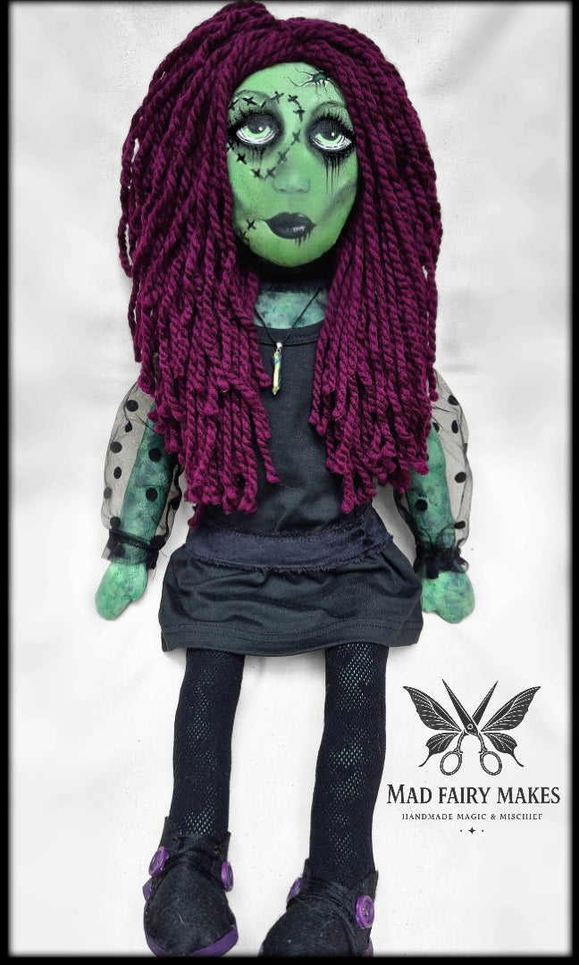This is Frankie, your perfectly punk little ghoul with a heart as stitched as her soul. Handcrafted with care, she’s rocking deep magenta hair, green zombie skin, and a stitched heart around one eye that proves love never dies. Her cute black dress with punk flair adds just the right touch of rebellion — because spooky girls deserve to look fabulous too.